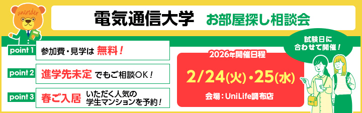 UniLifeは学生様のお部屋探しをサポートします!電気通信大学の学生様には、生協利用券3,000円分をプレゼントしております!お気軽にお問い合わせください。