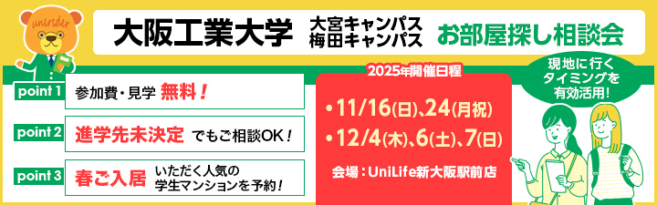大阪工業大学へのご進学をご検討している方、まずはUniLife新大阪駅前店へお問合せ下さい
