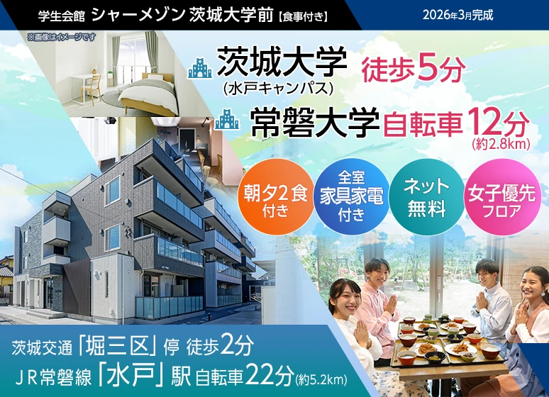 2026年3月完成の食事付き学生マンション!茨城大(水戸)まで徒歩5分で通学便利☆ネット無料+家具家電付きで引越しの費用や手間を軽減できます♪