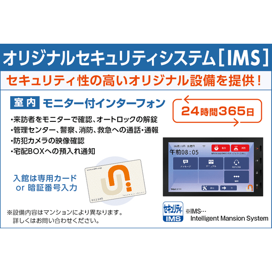 UMSS(UniLife® Mansion Security System)は、UniLifeがプロデュースする「安心・安全・快適」なセキュリティシステムです。オートロック・防犯カメラが管理センターと24時間365日連動し、快適で安全なひとり暮らしをサポートしています。居室のモニター付インターフォンはオートロックと宅配BOXに連動、コンセント型Wi-Fiも装備されインターネット接続もラクラクです。