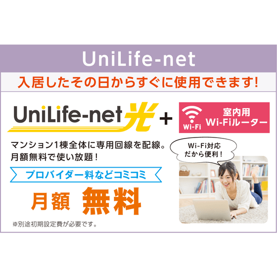 光インターネット専用回線を、マンション1棟全体に配線。入居したその日からすぐ使用できます。回線基本料金・回線使用料・プロバイダ料金込みの月額無料!Wi-Fi対応でスマホやパソコン、ゲーム等快適にネット生活が楽しめます。
