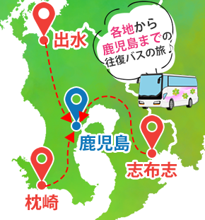3つのルートで鹿児島市内行きのバスツアーです。 交通費無料、直行便で乗り継ぎや乗換えも不要。