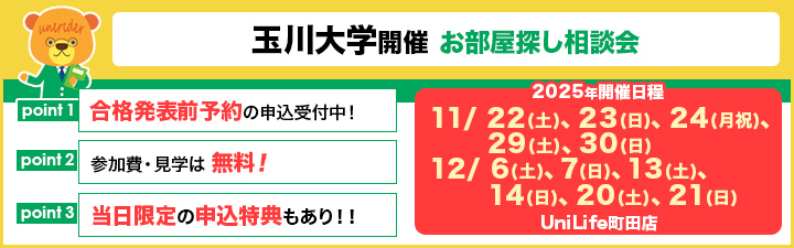 UniLifeは株式会社タマガワイーサポート(玉川学園事業法人)と業務提携をしております。玉川大学の学生様は【仲介手数料50%OFF】でご契約いただけます!
