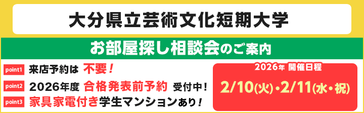 【大分県立芸術文化短期大学】ご進学決定・受験予定の皆様へ、オススメ学生マンション(新生活応援キャンペーン実施中)