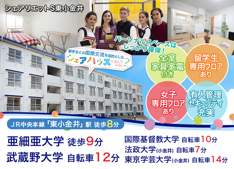 最寄り駅の「東小金井」駅周辺にはドラッグストアや飲食店もあり生活しやすい住環境。学生同士のシェアハウスで賑やかな楽しい学生生活を始めてみませんか。