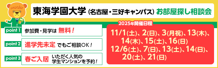 >>東海学園大学(名古屋キャンパス)に通学便利なマンションアパートはコチラ