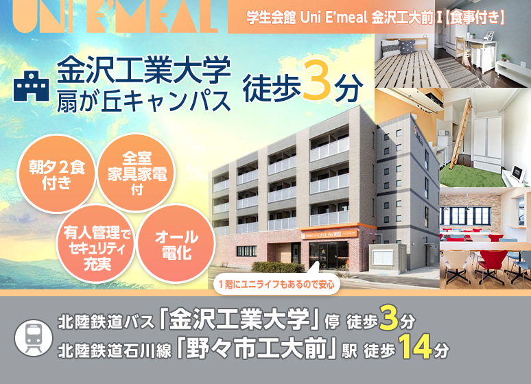 【学生会館 Uni E’meal 金沢工大前Ⅰ【食事付き】】(石川県野々市市高橋町24-3-3)