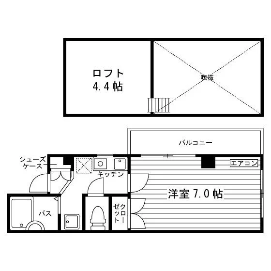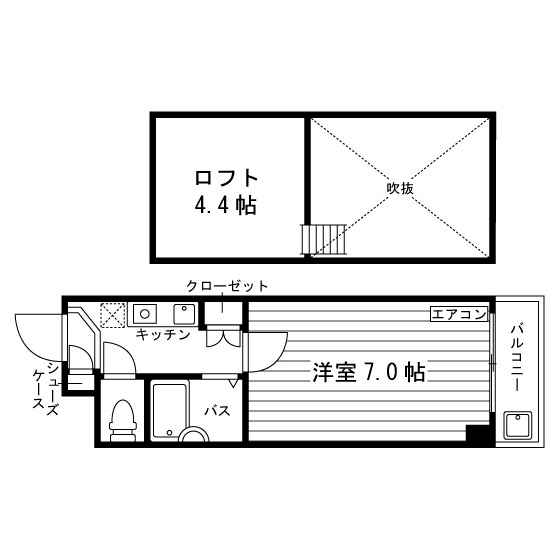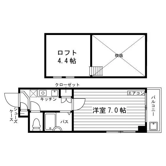 セパレート(バス・トイレ)/洗濯機置場(室外)/ガスコンロ(1口)/フローリング/ロフト/バルコニー/収納/シューズケース/エアコン/個別給湯(ガス) |