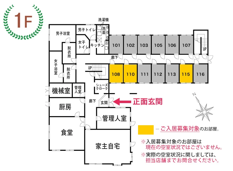 1Fには食堂、共用浴場、管理人室などがあります。エントランスにはオートロック等セキュリティ設備があり、防犯面も安心です。