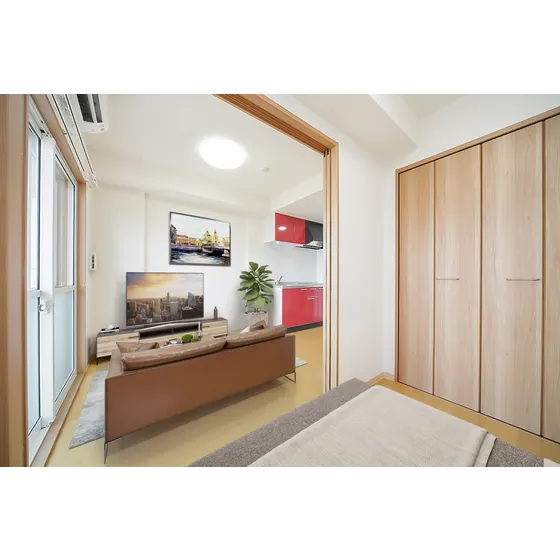 セパレート(バス・トイレ)/独立洗面化粧台/洗濯機置場(室内)/温水洗浄便座/浴室乾燥機/IHコンロ(2口)/家具家電付(一部)/居室照明器具/複層ガラス/バルコニー/収納/シューズケース/暗証番号式キー/エアコン |