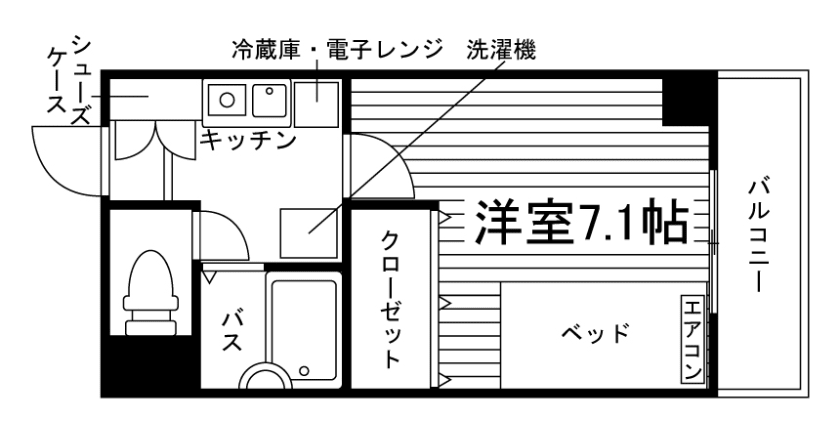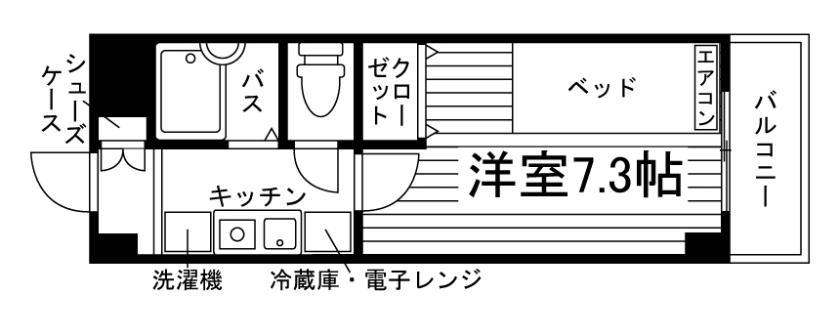 セパレート(バス・トイレ)/洗濯機置場(室内)/温水洗浄便座/ガスコンロ(1口)/家具家電付(一部)/居室照明器具/フローリング/バルコニー/収納/シューズケース/インターフォン(TVモニター付)/エアコン |