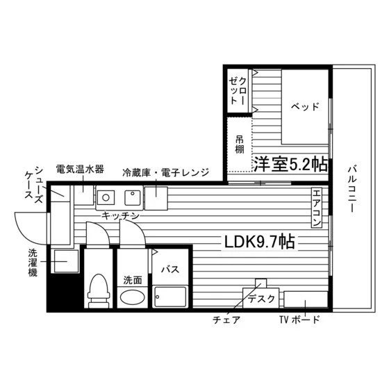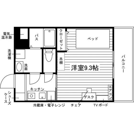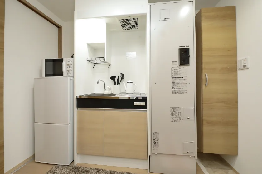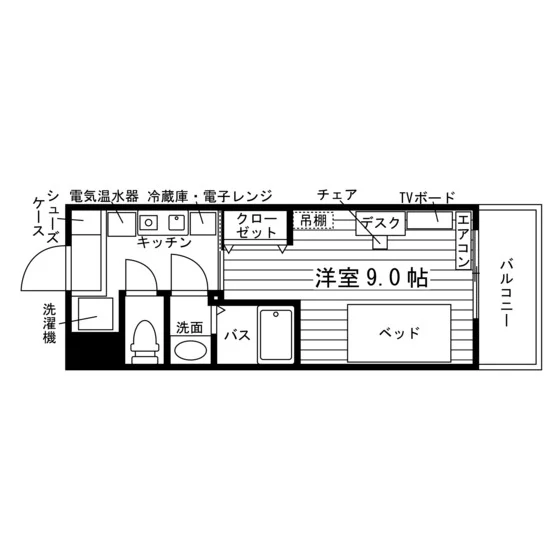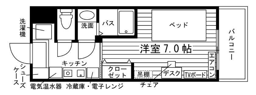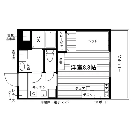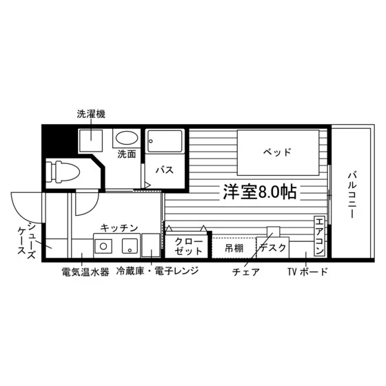 独立洗面化粧台/セパレート(バス・トイレ)/洗濯機/浴室乾燥機/温水洗浄便座/IHコンロ(1口)/家具家電付/冷蔵庫(2ドア)/玄関センサー感知ライト/居室照明器具/バルコニー/フローリング/収納/シューズケース/吊棚/インターフォン(TVモニター付)/暗証番号式キー/エアコン/個別給湯(電気)/個別給湯(電気温水器)/オール電化(ガス無し) |