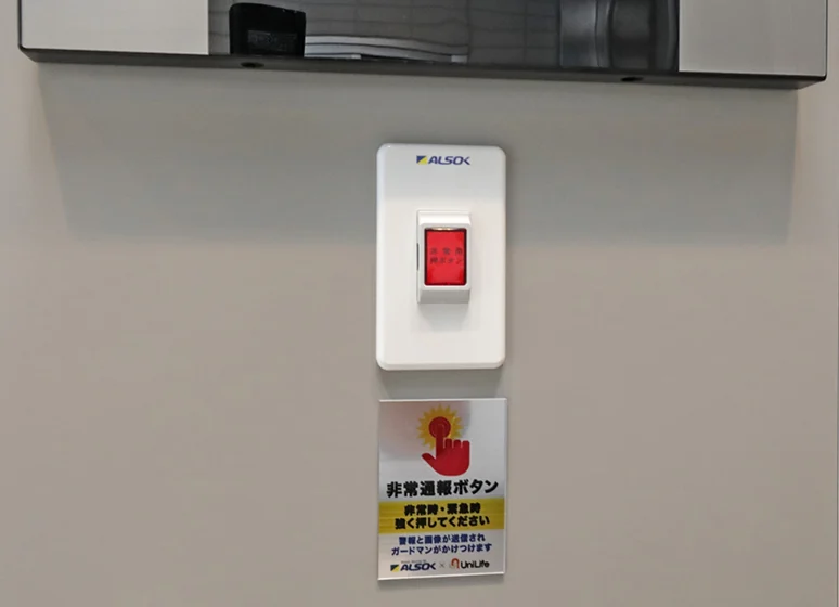 共用部の非常ボタンを押すことでベルが鳴動し異常を通報。ALSOKまたは、SECOMの管制センターにてカメラ画像や音声通話で状況を確認、必要時はガードマンが24時間体制で現地に駆け付けます。