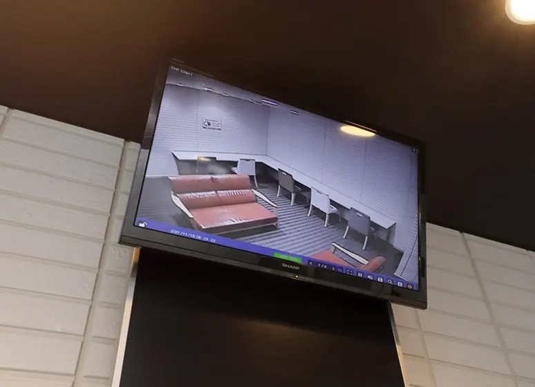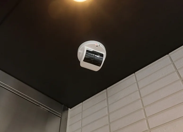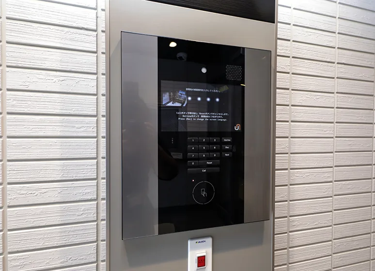 館内で異常を発見した際、共用部の非常ボタンを押すことでベルが鳴動し異常を通報。ALSOKまたはSECOM管制センターにてカメラ画像や音声通話で状況を確認、必要時はガードマンが24時間体制で現地に駆け付けます。
