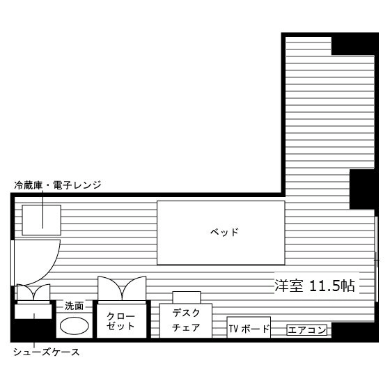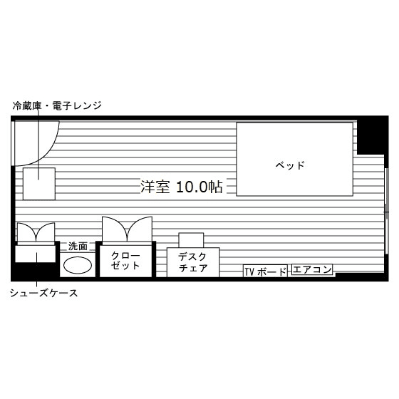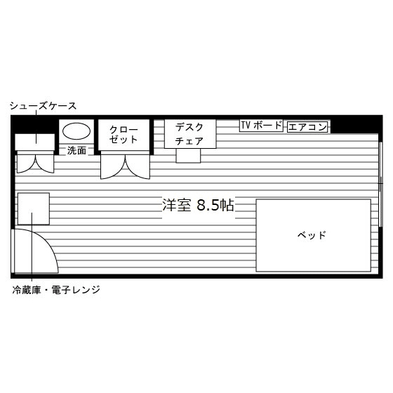 独立洗面化粧台(一部)/室内物干/家具家電付/冷蔵庫(2ドア)/居室照明器具/ベッド/電子レンジ/フローリング/バルコニー/防犯シャッター(一部)/収納/シューズケース/インターフォン(TVモニター付)/防犯ディンプルキー/エアコン |