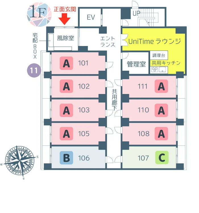 プロパンガス/BSアンテナ/CSアンテナ/UniLife-net光(UCOM光) Wi-Fi対応/インターネット対応(無料)/オートロック/防犯カメラ(ユニセーフ24仕様)/エントランス防犯モニター/エレベーター/宅配BOX/駐輪場(自転車のみ)/キッチン(共同)/食堂/ユニタイムラウンジ/コミュニティルーム |