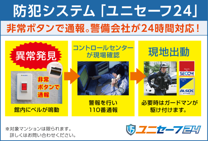 共用部の非常ボタンを押すことでベルが鳴動し異常を通報。ALSOKまたは、SECOMの管制センターにてカメラ画像や音声通話で状況を確認、必要時はガードマンが24時間体制で現地に駆け付けます。
