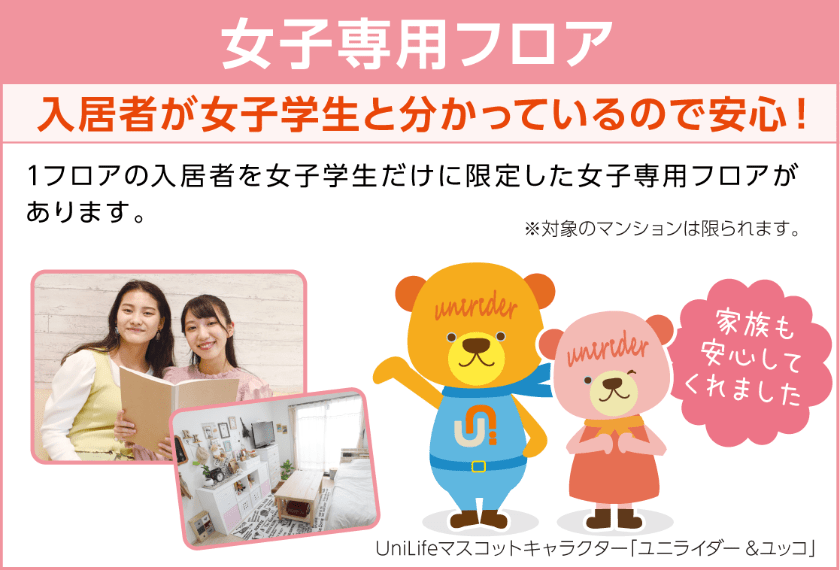 当学生会館では、入居者を女子だけに限定した 「女子専用エリア」を設けております。