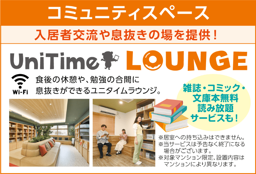共用のコミュニティスペース「UniTime ラウンジ」では、雑誌・コミック・文庫本等を多数取り揃えています。