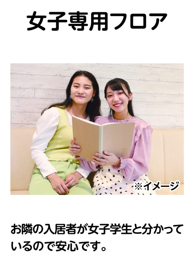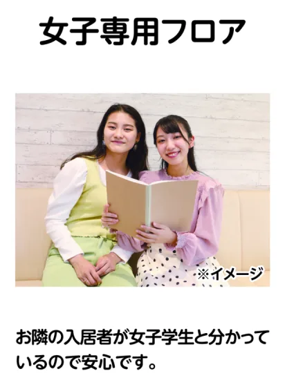 当学生会館では、入居者を女子だけに限定した 「女子専用フロア」を設けております。