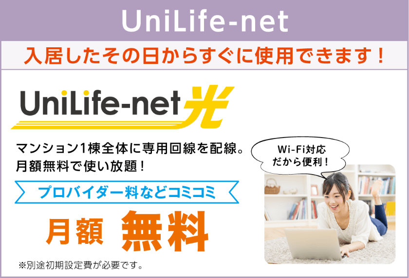 光インターネット専用回線を、マンション1棟全体に配線。入居したその日からすぐ使用できます。回線基本料金・回線使用料・プロバイダ料金込みの月額無料!Wi-Fi対応でスマホやパソコン、ゲーム等快適にネット生活が楽しめます。