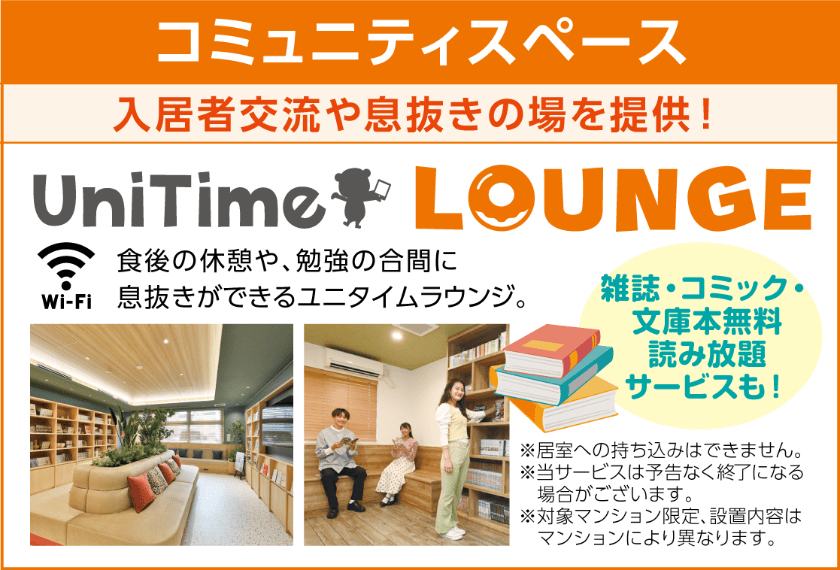 共用のコミュニティスペース「UniTime ラウンジ」では、雑誌・コミック・文庫本等を多数取り揃えています。