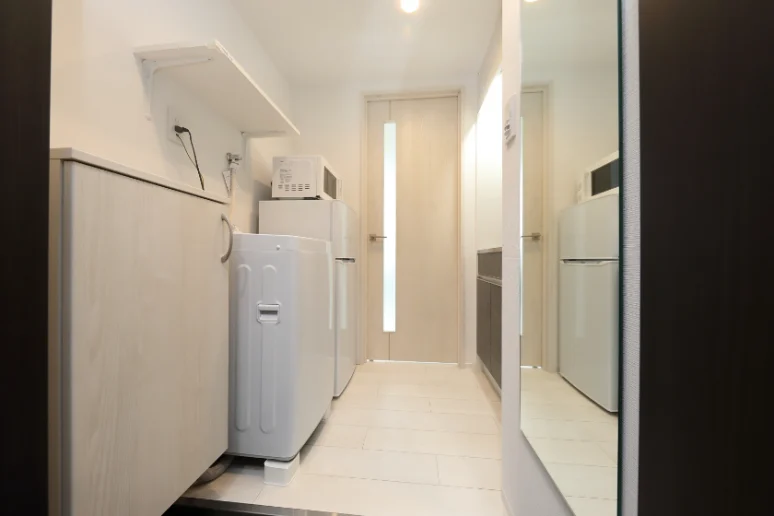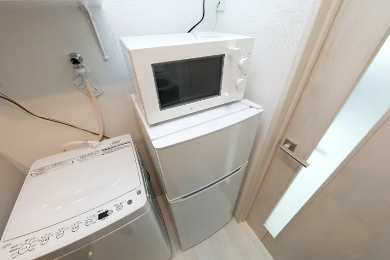 洗濯機、冷蔵庫、電子レンジ、照明器具が付いています。