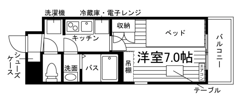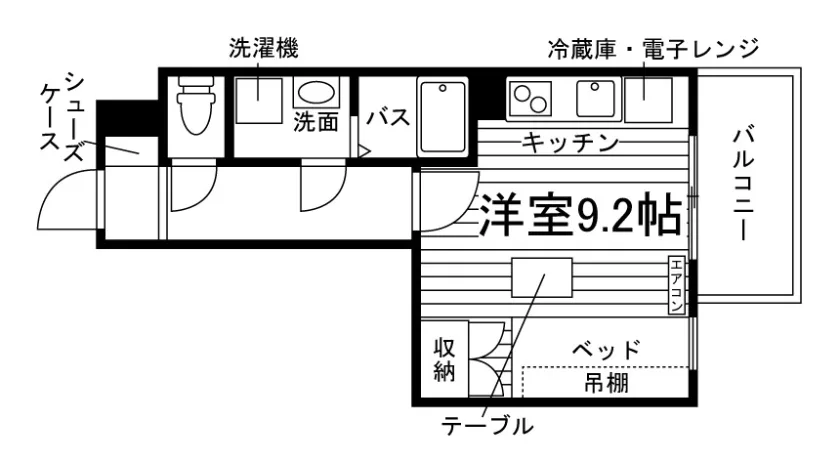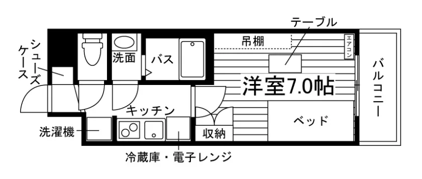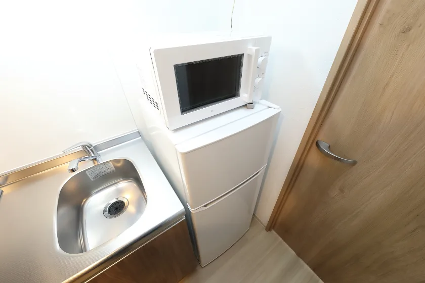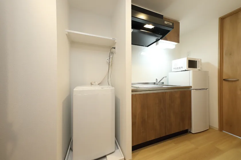当学生マンションの居室には、予め全室に家具家電が備え付けられています。