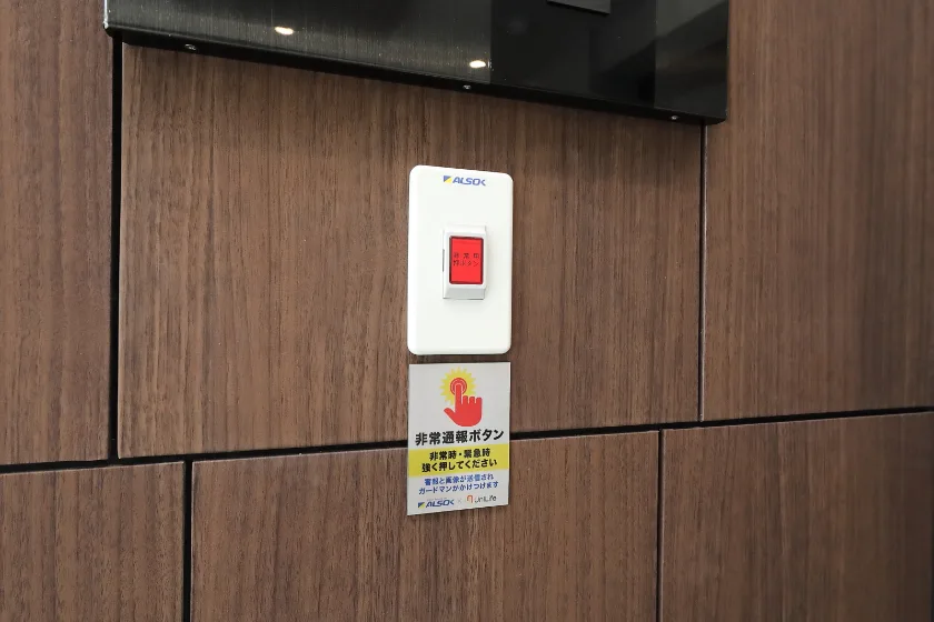 共用部の非常ボタンを押すことでベルが鳴動し異常を通報。ALSOKまたは、SECOMの管制センターにてカメラ画像や音声通話で状況を確認、必要時はガードマンが24時間体制で現地に駆け付けます。