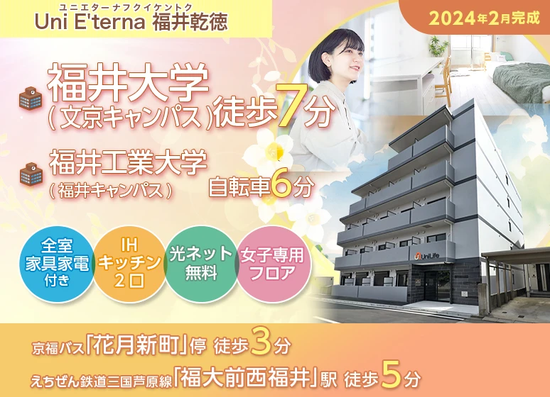 ☆福井大学生協サポート付きマンション☆2024年2月完成!福井大(文京)まで徒歩7分で通学に便利!全室家具家電付きで引越しラクラク☆うれしいネット無料♪