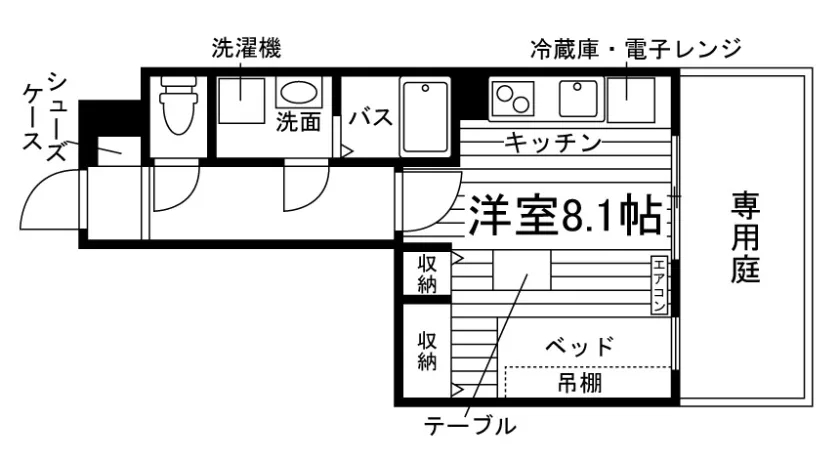 独立洗面化粧台/セパレート(バス・トイレ)/洗濯機置場(室内)/洗濯機/浴室乾燥機/温水洗浄便座/IHコンロ(2口)/家具家電付/冷蔵庫/居室照明器具/電子レンジ/ベッド/専用庭/バルコニー/フローリング/収納/シューズケース/吊棚/インターフォン(TVモニター付)/暗証番号式キー/エアコン/個別給湯(ガス) |