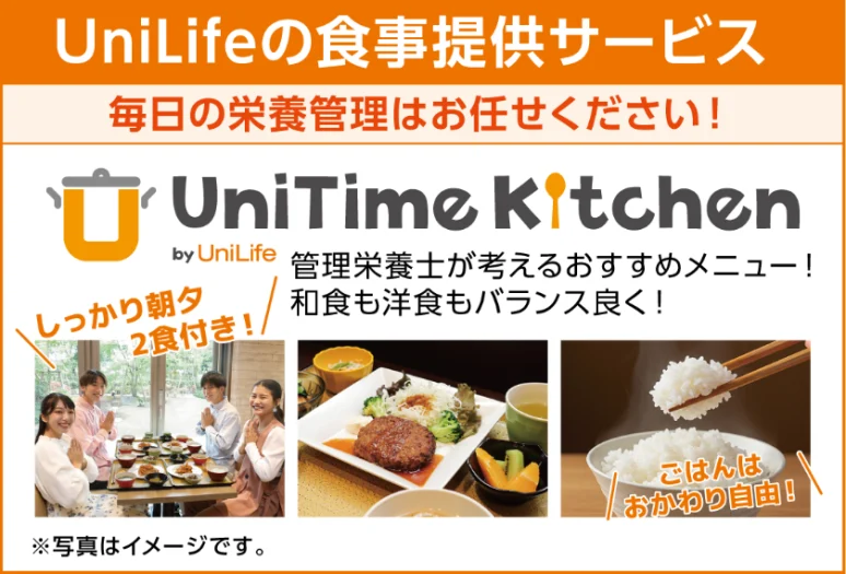 当学生会館は、UniLifeオリジナルサービス『UniTime Kitchen』提供の、朝夕2食の食事付きです。