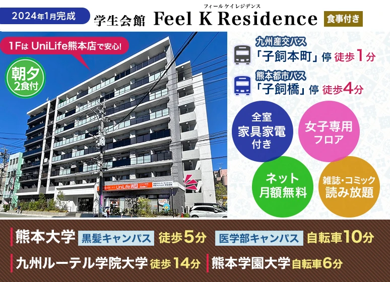 2024年1月完成の朝夕2食&全室家具家電付き学生マンション☆熊本大学(黒髪)まで徒歩5分!1FがUniLife店舗で安心