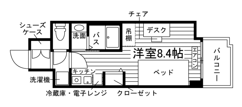 独立洗面化粧台/セパレート(バス・トイレ)/洗濯機/浴室乾燥機/温水洗浄便座/IHコンロ(1口)/家具家電付/冷蔵庫(2ドア)/居室照明器具/玄関センサー感知ライト/電子レンジ/ベッド/バルコニー/シューズケース/吊棚/収納/インターフォン(TVモニター付)/暗証番号式キー/エアコン/個別給湯(ガス) |