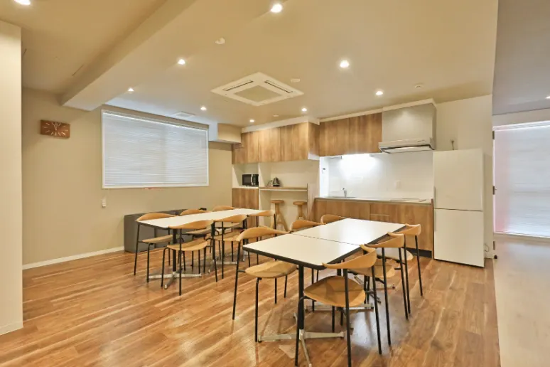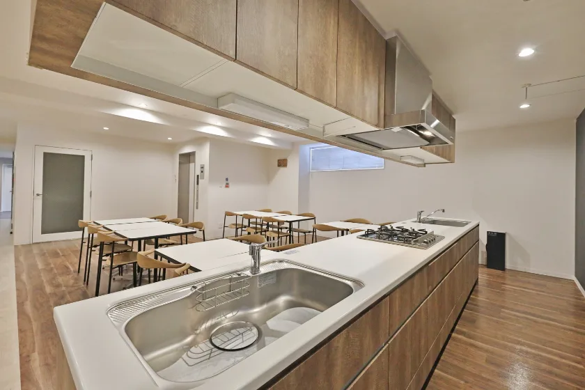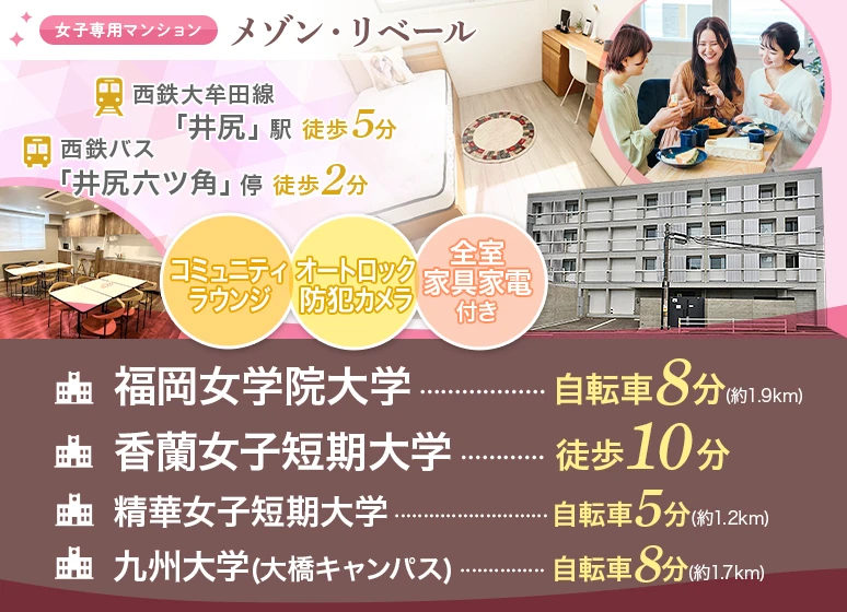 井尻駅徒歩圏内の家具家電付き女子学生専用マンション! オートロック・防犯カメラ、セキュリティーに特化した緊急通知ボタンもあり、初めてのひとり暮らしも安心です☆ 各階にある共用キッチン・ラウンジで入居者様同士で楽しくお料理できますね♪