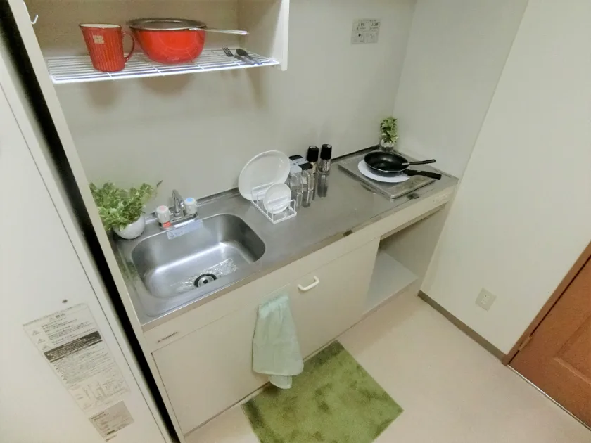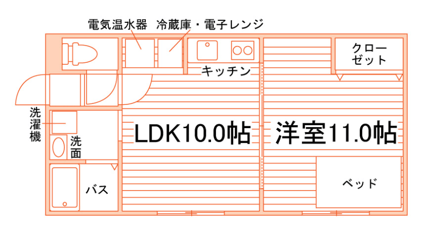 独立洗面化粧台/セパレート(バス・トイレ)/洗濯機/洗濯機置場(室内)/室内物干/温水洗浄便座/IHコンロ/家具家電付/冷蔵庫/居室照明器具/電子レンジ/ベッド/フローリング/収納/インターフォン/蓄熱式電気暖房機/個別給湯(電気温水器)/個別給湯(電気)/オール電化(ガス無し) |
