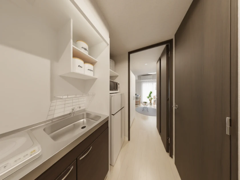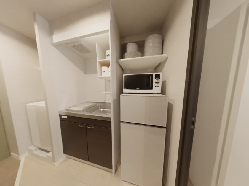 セパレート(バス・トイレ)/独立洗面化粧台/洗濯機/浴室乾燥機/温水洗浄便座/IHコンロ(1口)/家具家電付/冷蔵庫(2ドア)/居室照明器具/電子レンジ/ベッド/バルコニー/吊棚/収納/シューズケース/インターフォン(TVモニター付)/防犯ディンプルキー/エアコン/個別給湯(ガス) |