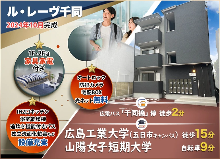 2024年10月完成の築浅学生アパートメント♪ インターネット無料や設備充実! 広島工業大学や山陽女子短期大学の学生様へおすすめです☆