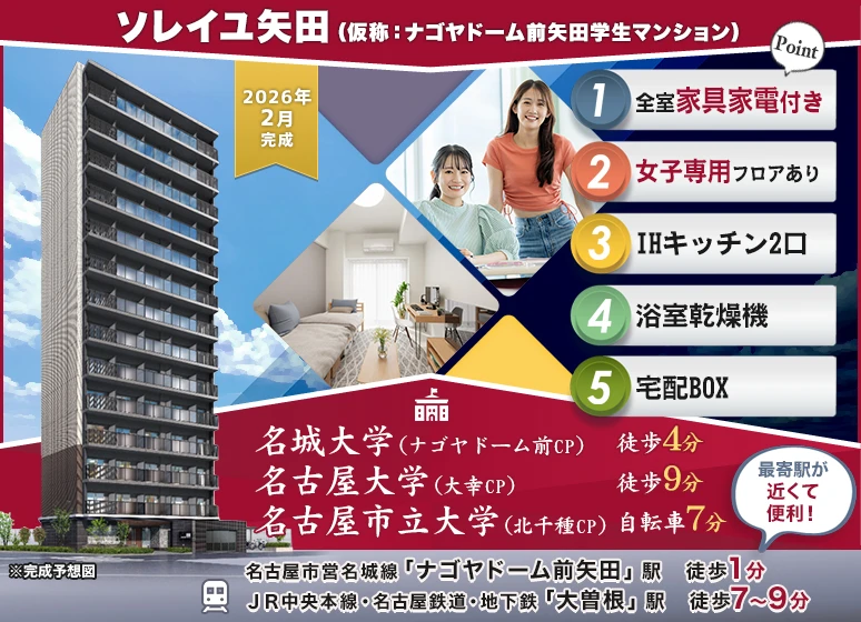 「ナゴヤドーム前矢田」駅 徒歩1分の新築学生マンション! 「大曽根」駅も徒歩圏内で地下鉄・JR・名鉄沿線の学校も通学便利◎ 新品家具家電付きで引越しラクラク!