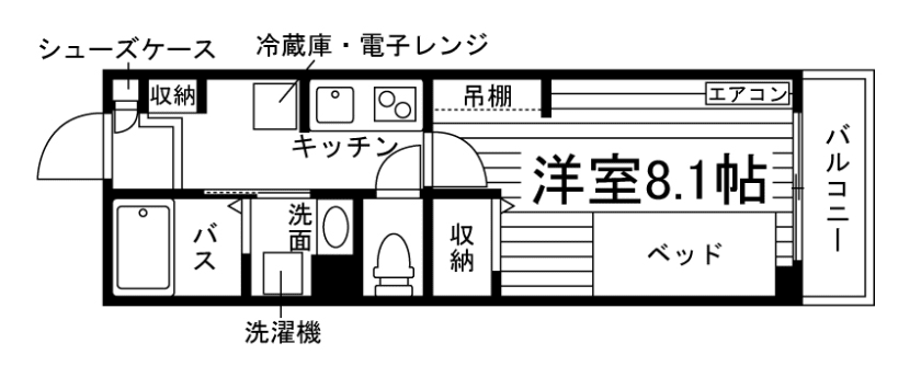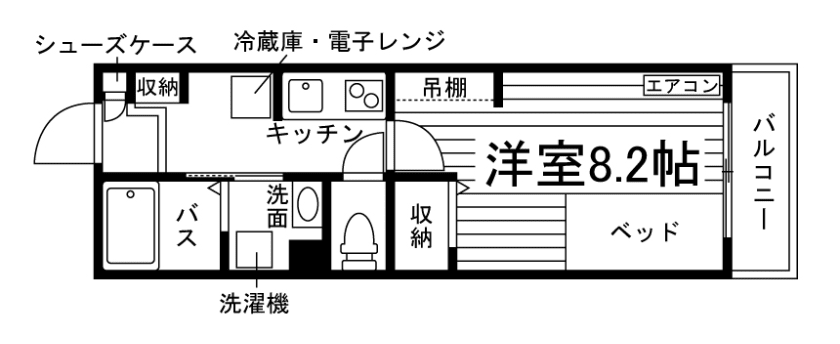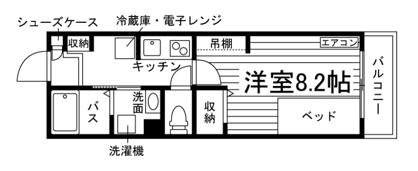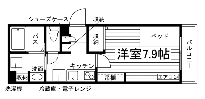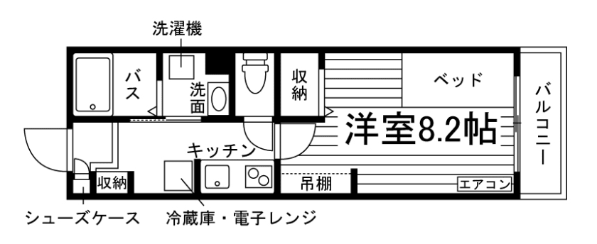 セパレート(バス・トイレ)/独立洗面化粧台/洗濯機/洗濯機置場(室内)/浴室乾燥機/温水洗浄便座/IHコンロ(2口)/家具家電付/冷蔵庫/居室照明器具/玄関センサー感知ライト/電子レンジ/ベッド/バルコニー/防犯シャッター/吊棚/収納/シューズケース/インターフォン(TVモニター付)/防犯ディンプルキー/エアコン/個別給湯(ガス) |