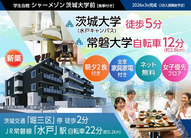 ■特割キャンペーン実施中■≪新築≫2026年3月完成予定の食事付き学生マンション! 茨城大(水戸)まで徒歩5分で通学便利☆ ネット無料+新品家具家電付きで引越しの費用や手間を軽減できます♪