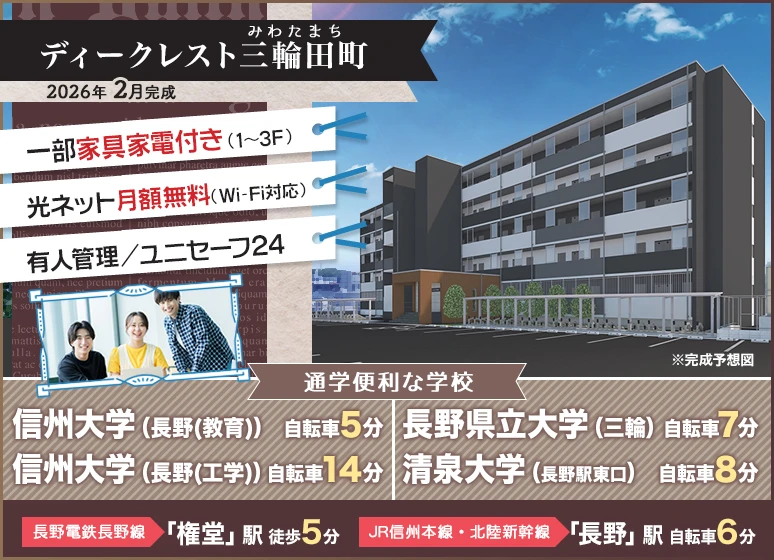 《新築》2026年2月完成!信州大(長野教育)まで自転車5分! 1~3Fは学生専用&家具家電付きで信州大(教育・工学部)のキャンパス移動や長野県立大の学校寮からの住替えの方にオススメ♪有人管理でひとり暮らしするにも安心ですね☆