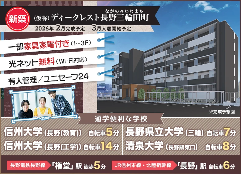 《新築》2026年2月完成予定!信州大(長野教育)まで自転車5分! 1~3Fは学生専用&家具家電付きで信州大(教育・工学部)のキャンパス移動や長野県立大の学校寮からの住替えの方にオススメ♪有人管理でひとり暮らしするにも安心ですね☆