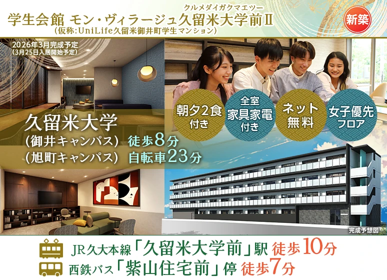 2026年3月完成予定!朝夕2食付き新築学生マンション☆久留米大(御井)まで徒歩8分♪