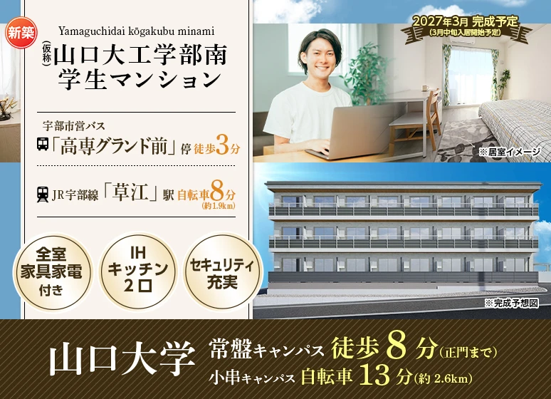 ★山口大(工学部・医学部)キャンパス移動の方にオススメ★ 《新築》2027年3月完成予定の学生マンション! 山口大(工学部)まで徒歩8分・(医学部)まで自転車13分☆ 全室家具家電付き・ネット無料・浴室乾燥機など設備が充実♪