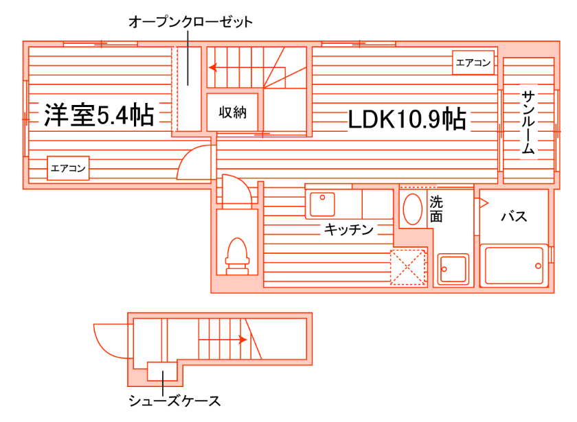 セパレート(バス・トイレ)/独立洗面化粧台/洗濯機置場(室内)/室内物干/追焚き機能付バス/浴室乾燥機/温水洗浄便座/ガスコンロ(持込)/居室照明器具/サンルーム/フローリング/シューズケース/収納/インターフォン(TVモニター付)/暗証番号式キー/エアコン/個別給湯(ガス) |