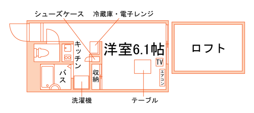 セパレート(バス・トイレ)/洗濯機/洗濯機置場(室内)/浴室乾燥機/RHコンロ(2口)/家具家電付/冷蔵庫/居室照明器具/電子レンジ/ロフト/収納/シューズケース/インターフォン(TVモニター付)/エアコン/個別給湯(ガス) |