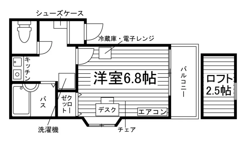 セパレート(バス・トイレ)/洗濯機/洗濯機置場(室内)/温水洗浄便座/ガスコンロ(1口)/家具家電付/冷蔵庫(2ドア)/居室照明器具/電子レンジ/フローリング/ロフト/バルコニー/収納/シューズケース/インターフォン(TVモニター付)/防犯ディンプルキー/エアコン/個別給湯(ガス) |
