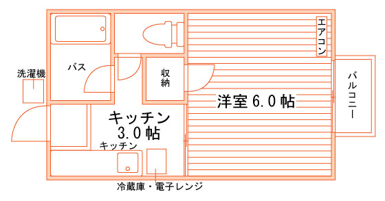 セパレート(バス・トイレ)/洗濯機/洗濯機置場(室外)/ガスコンロ(持込)/家電付/冷蔵庫/居室照明器具/電子レンジ/フローリング/バルコニー/収納/エアコン/個別給湯(ガス)