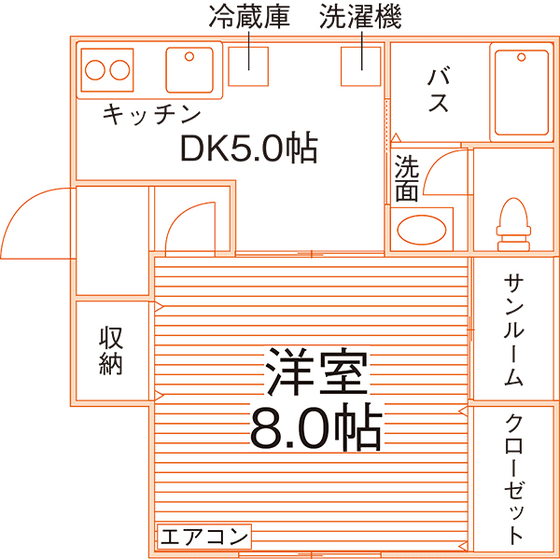 独立洗面化粧台/セパレート(バス・トイレ)/洗濯機/洗濯機置場(室内)/温水洗浄便座/ガスコンロ(2口)/家電付/冷蔵庫/フローリング/サンルーム/ロフト(一部)/収納/インターフォン(TVモニター付)/エアコン/個別給湯(ガス) |
